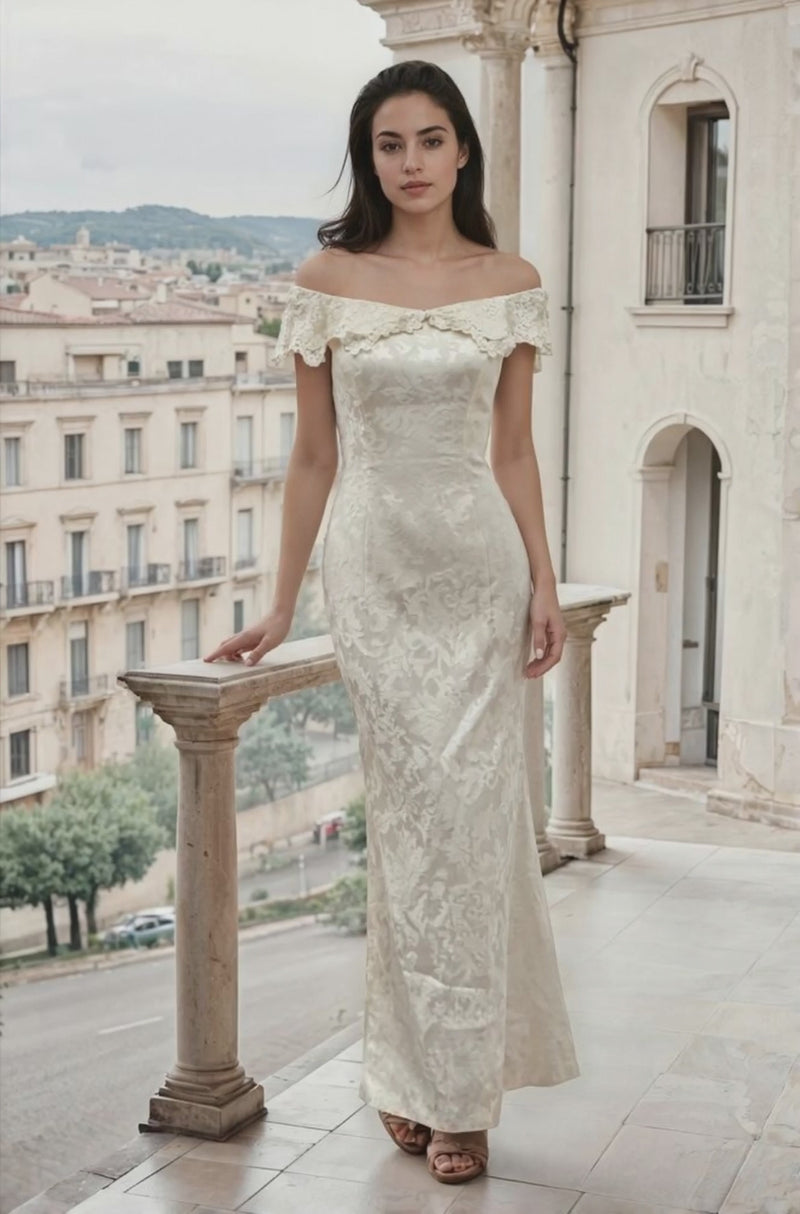 The gown features an off-the-shoulder neckline trimmed with delicate scalloped lace, framing the décolletage with soft femininity. Crafted in an all-over floral lace, the fitted silhouette skims the body beautifully before flowing into a graceful chapel-length train. The back is finished with a clean zip closure and a dramatic satin bow at the waist, adding a touch of vintage couture charm.